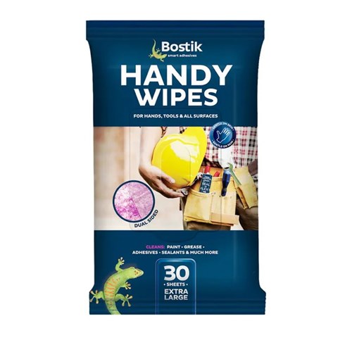 Bostik Handy Wipes are waterless, dual-sided hand towels that have a convenient scrub side for removing tough grime, and one for gentle wiping away. Specially formulated, they quickly and effectively remove sealant, tar, dirt, grease, oil, adhesive, paint and ink from tools and equipment.
