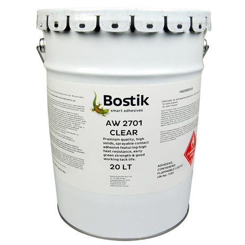 Bostik AW 2700 Contact Adhesive Clear 20lt is a premium quality, high solids, sprayable contact adhesive, featuring high heat resistance, good spray ability, and early green strength coupled with a good working tack life. It is suitable for use in residential and commercial applications including boat and automotive interior applications where laminating or upholstery trimming work is required.
