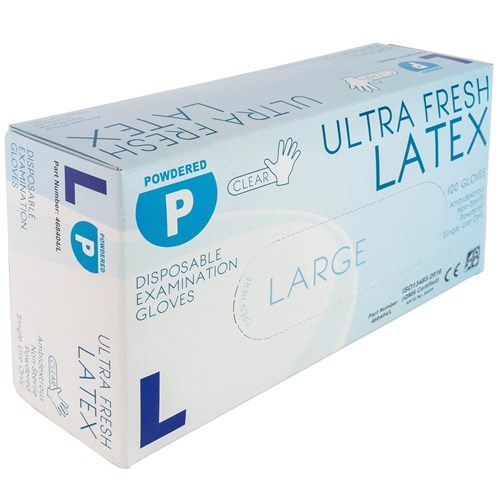 Latex Powdered Glove Large premium weight clear latex powdered disposable gloves. Pack of 100 gloves.